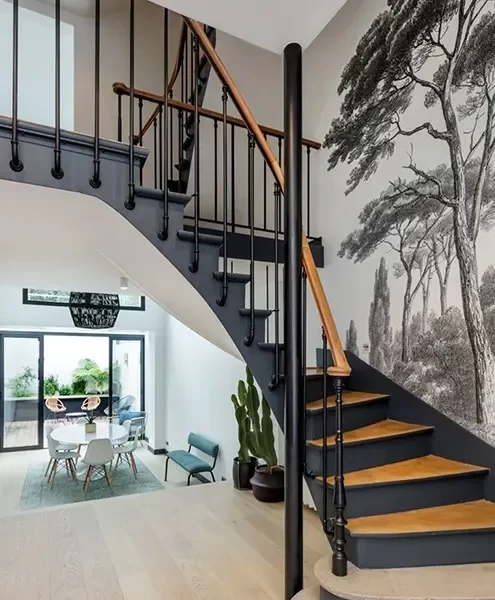 Dans cet intérieur où se conjuguent grâce et fonctionnalité, l’escalier devient une œuvre d’art en soi, élevant la notion de transition spatiale à un niveau de conception supérieur. La montée élégante des marches en bois sombre contraste avec les balustrades en fer noir, évoquant une esthétique industrielle chic. L’escalier courbe avec fluidité, guidant le regard vers l’étage supérieur tout en créant un jeu de formes et de volumes qui captive et intrigue.