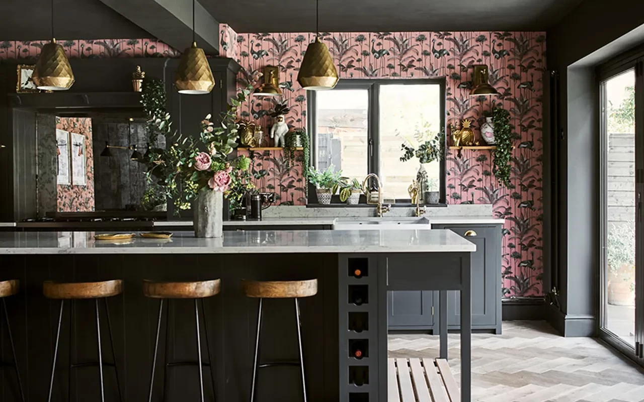 Une sublime cuisine avec du papier-peint Ă  motifs sur les murs